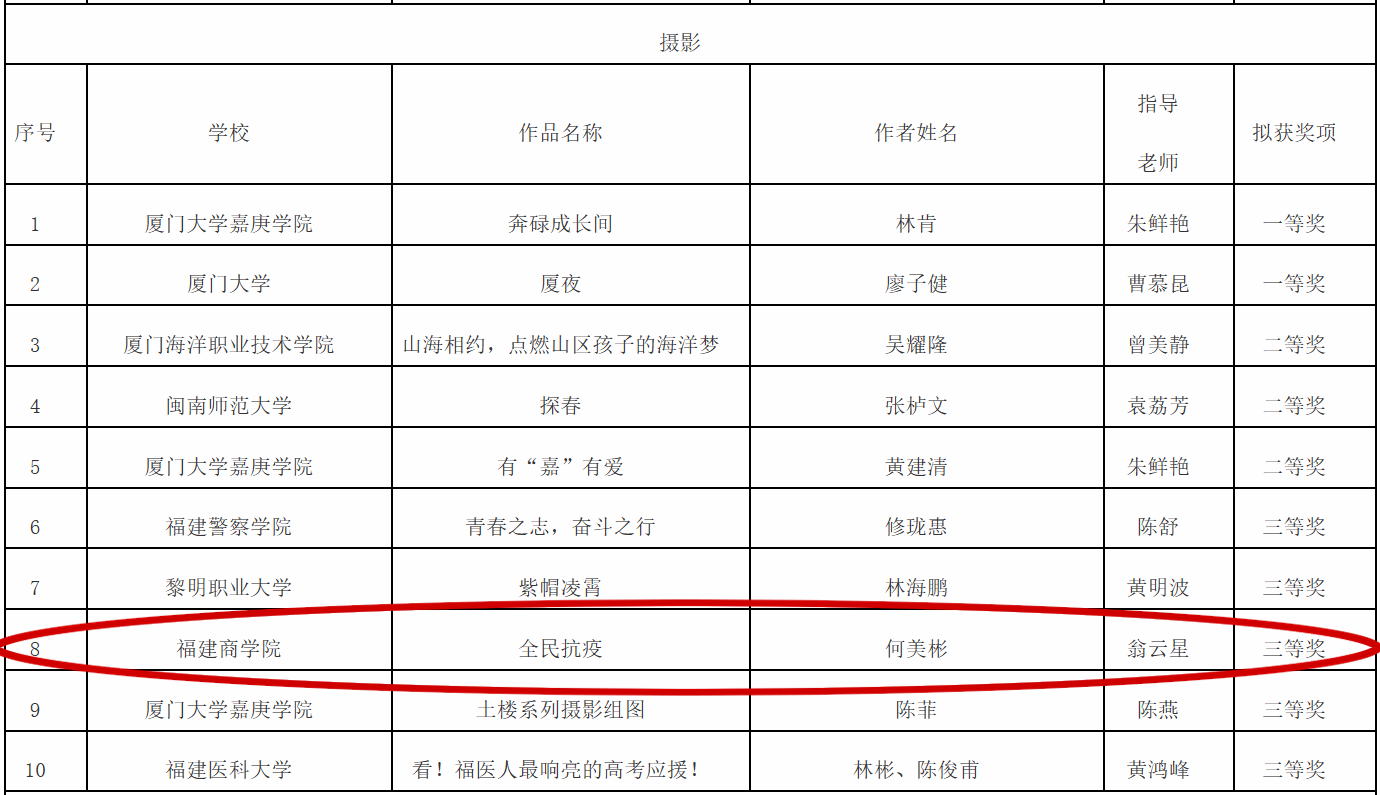 近日,由福建省委教育工委、福建省委网信办联合举办的第六届全省大学生网络文化节获奖名单揭晓。其中,必赢官网学子何美彬的作品《全民抗疫》(指导教师:翁云星)在此次比赛中荣获摄影类作品三等奖。