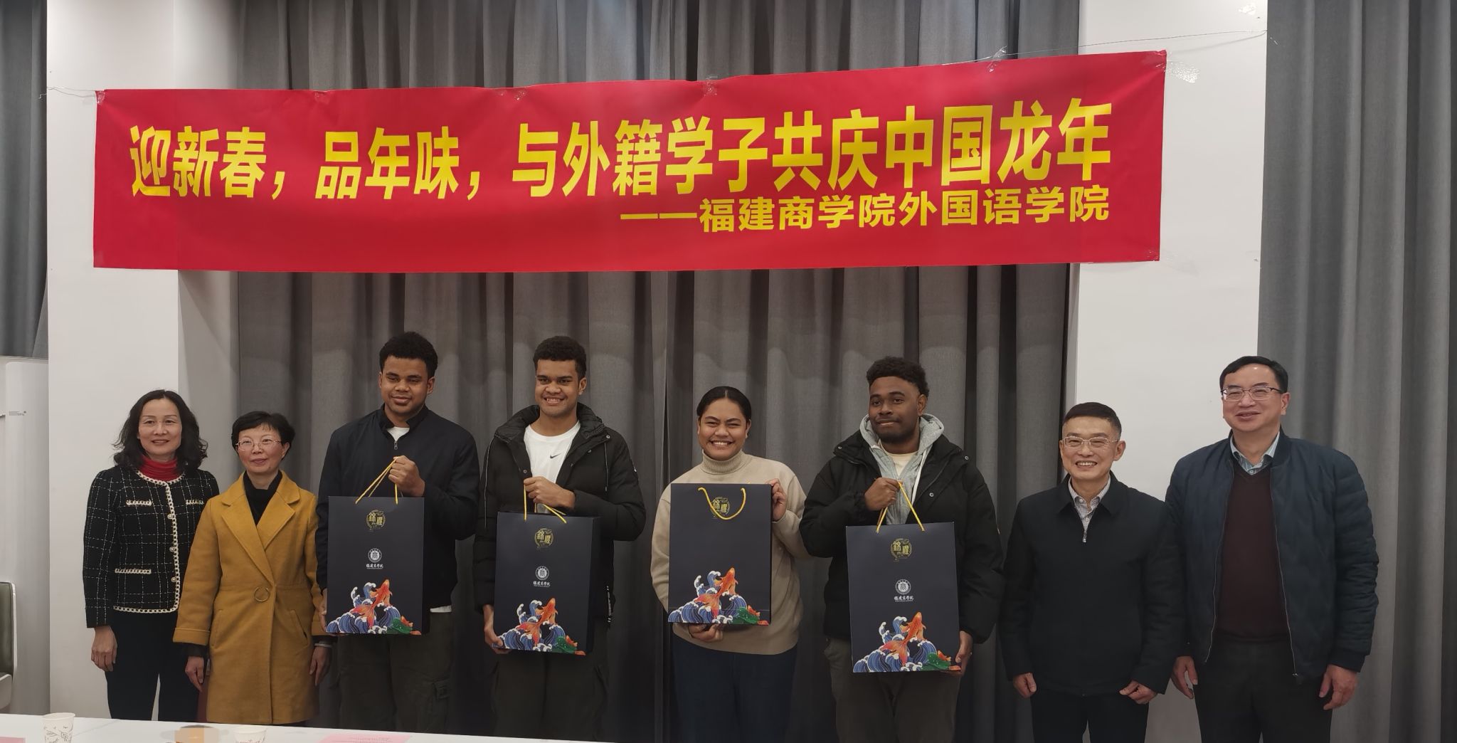 2月7日下午,必赢国际437官网举办“迎新春,品年味,共庆中国龙年”留学生新春座谈会。校党委书记吴访益、校党委副书记蒲文庆、副校长林文艺,教务处、学工部、必赢国际437官网有关负责人以及留学生代表欢聚一堂,喜迎新春。