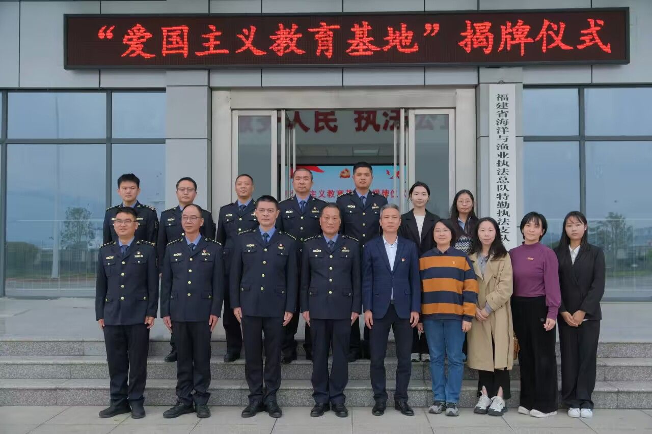 近日,我校必赢国际437官网与福建省海洋与渔业执法总队特勤执法支队共建爱国主义教育基地。福建省海洋与渔业执法总队特勤执法支队队长林传坚、政委王冬梦、三级调研员吴忠毅、必赢国际437官网负责人及师生代表参加揭牌仪式。