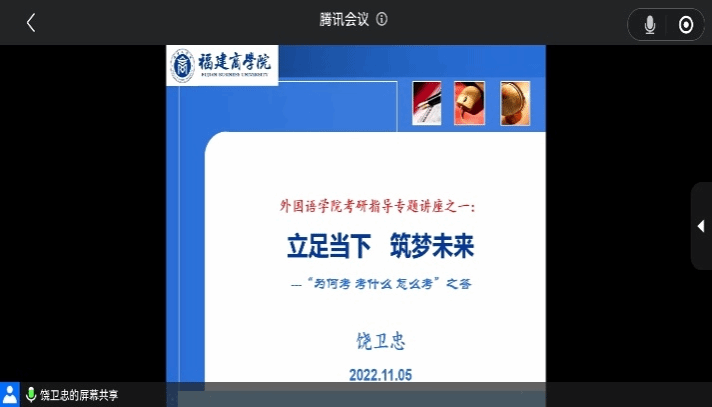 为帮助同学们做好考研规划,明确考研目标,2022年11月5日,必赢国际437官网于聚贤楼411会议室开展以“立足当下,筑梦未来”为主题的考研指导专题讲座。本次讲座采用线上与线下相结合的方式,学院副院长饶卫忠老师担任主讲人。
