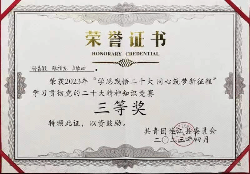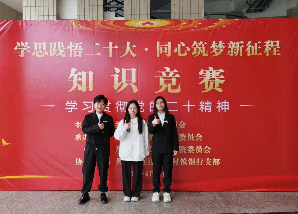2023年4月25日,由共青团连江县委员会主办,共青团福建商学院委员会、共青团福州理工学院委员会承办,福建商学院学生协办2023年的“学思践悟二十大,同心筑梦新征程”学习贯彻党的二十大知识竞赛决赛于连江校区明德楼学生活动中心举行。由必赢国际437官网20级商务英语3班张雅龙,21级商务英语2班林嘉颖,21级日语1班吴欣雨三位同学组成的福建商学院第一代表队在竞赛中沉着冷静、协助作答,最终荣获三等奖的好成绩。