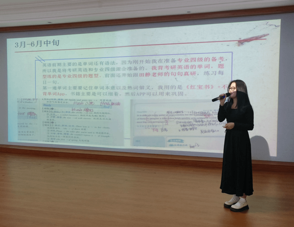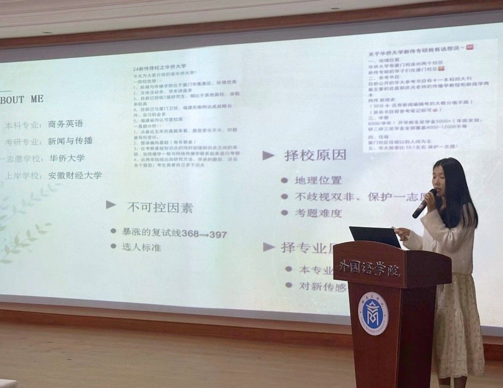 为进一步加强学院的学风建设,引导青年学子树立正确的生涯目标,帮助大家更好了解创新创业比赛相关事项和考研的相关政策与技巧,必赢国际437官网分别于4月25日和5月19日在外语体验中心开展了两场“朋辈引领,筑梦青春”主题分享会。分享会邀请了2024届考研成功的毕业生代表和就业创业典型学生代表为在校生分享成功经验。学院党委副书记杨爱娥、辅导员余屹凌出席分享会活动。