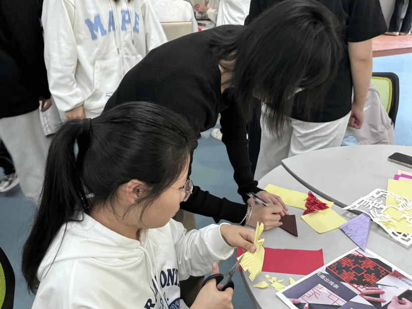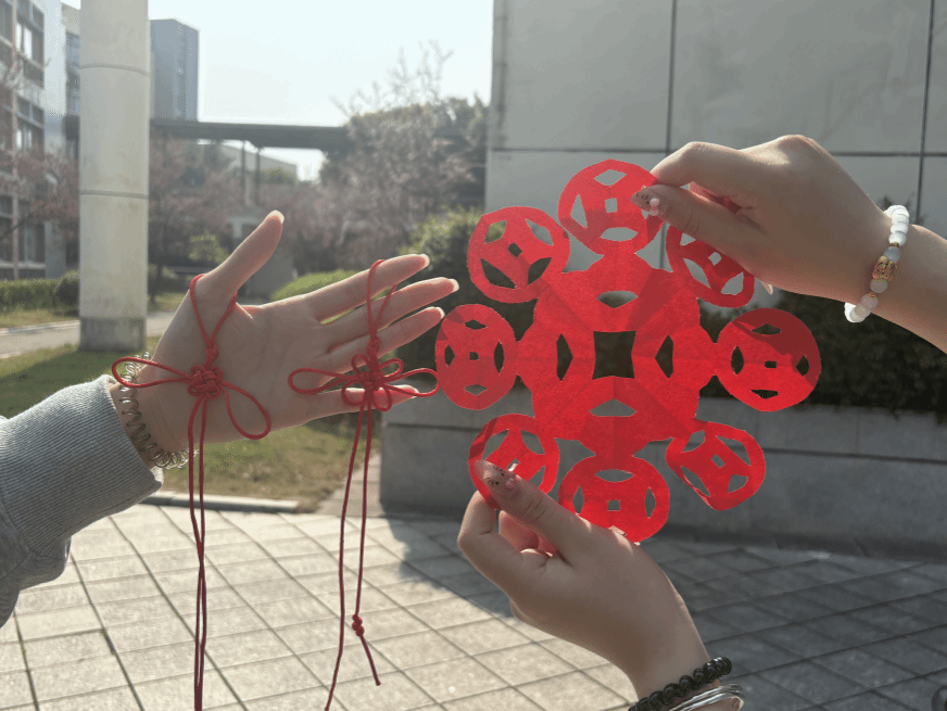 剪纸和中国结作为中国传统非遗项目,承载着深厚的民族智慧与文化内涵。活动现场,工作人员为同学们讲解了剪纸和中国结的历史渊源与艺术特点,并现场演示制作方法,从剪纸的图案设计、折叠技巧,到中国结的绳结编织、样式变化,让同学们对这两项传统技艺有了更深入的了解。在实践环节,同学们神情专注,认真对待每一个步骤,反复调整,与身边同学分享技巧与心得。剪刀在彩纸中穿梭,红绳在指尖缠绕,一张彩纸、一根红绳,翻转折叠间,寓意着幸福吉祥、寄托着美好祝福的剪纸与中国结便跃然眼前。